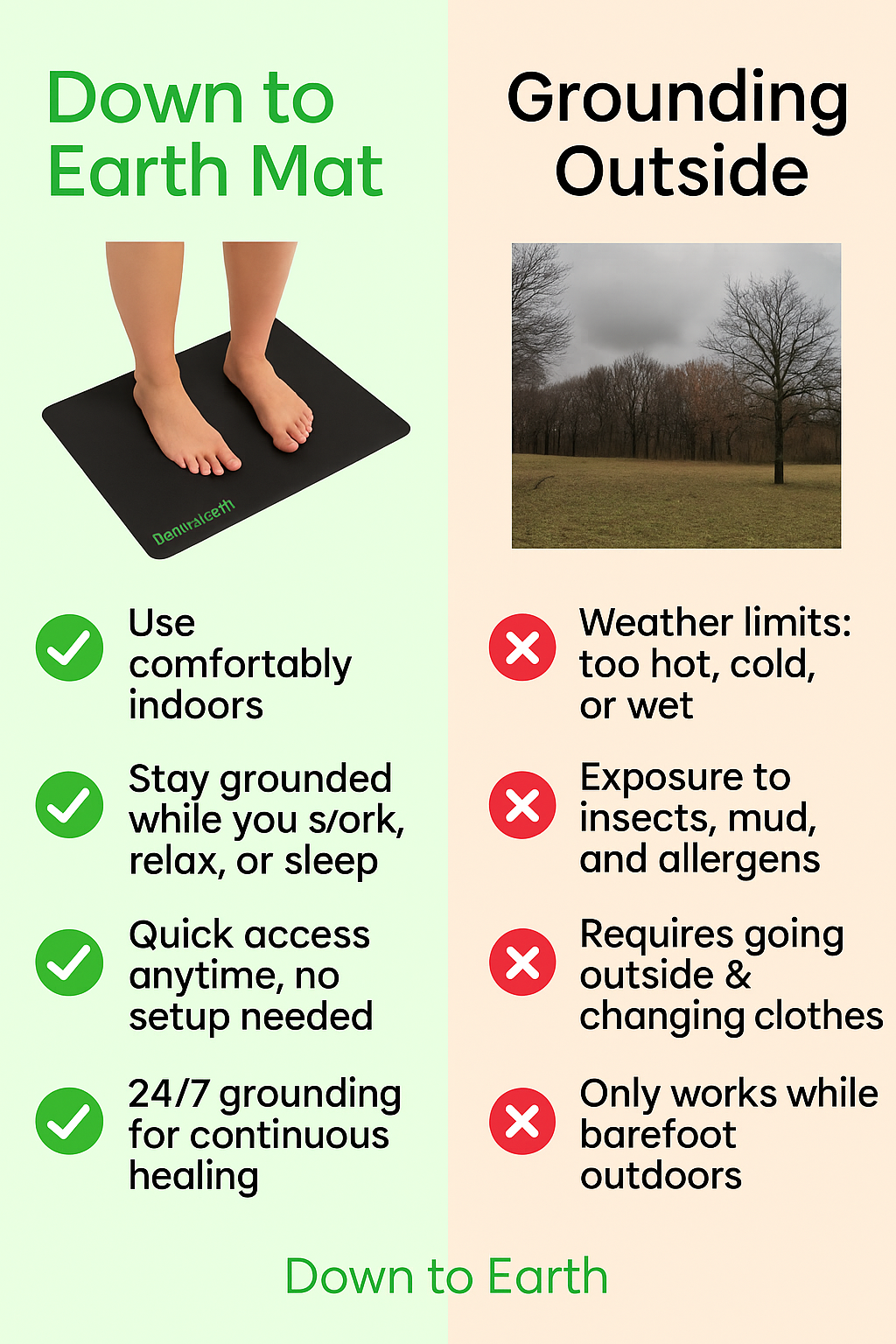 Reconnect with nature from the comfort of your home. The Down to Earth™ Mat is designed to restore balance, reduce inflammation, and improve sleep through advanced grounding technology. Perfect for daily use—whether at work, during meditation, or while resting.